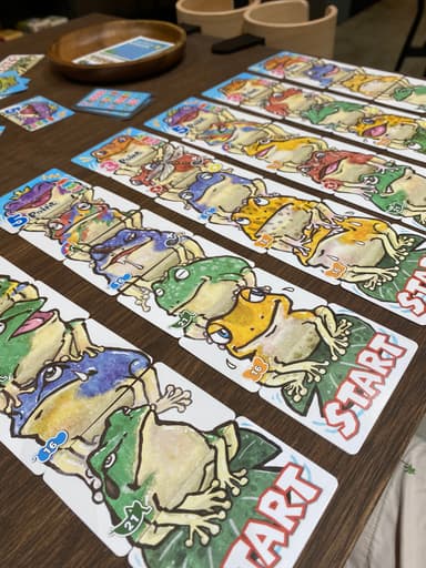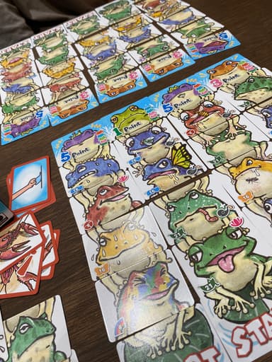 Players collect frog cards, and try to collect them in order to gain higher score. The rule is very simple and very easy to understand, and it is such as suitable game for little children as well as family. Expression on each frog is also very unique and fun to look at.