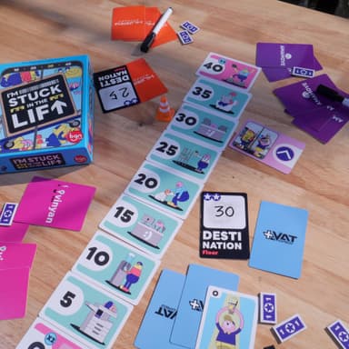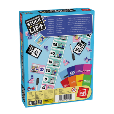 I’M STUCK IN THE LIFT is a fast-paced bidding and push-your-luck game for 3-8 players (10-15 minutes). At the start of the game, players will be given 2 dry-erase cards and 3 bidding cards, then players secretly write a target floor on their dry-erase cards. Each round, players will then choose one of three bidding cards from their hand (0, 5, or 10) and place it facedown. Once all cards are revealed, sum their values: the elevator ascends or descends by that total. Players then check if the elevator landed on their secret floor—if so, they score a point(s), and then they will select a new floor! But there’s a catch: every round, the construction cone (tracking the building’s blocked floors) drops one level closer to the ground. If the elevator stops where the construction cone is, no one will score points that turn, but they can still choose a new floor. The game ends when the cone reaches the bottom floor, and the player with the most points wins!